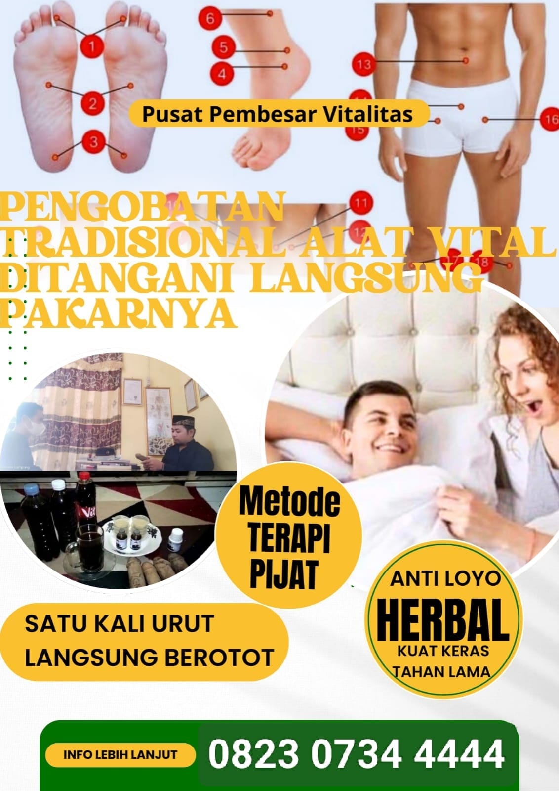 Jangan biarkan masalah vitalitas mengganggu kebahagiaan Anda. Segera lakukan konsultasi dan terapi dengan H. Abdul Azis. Praktek buka setiap hari, termasuk hari libur.