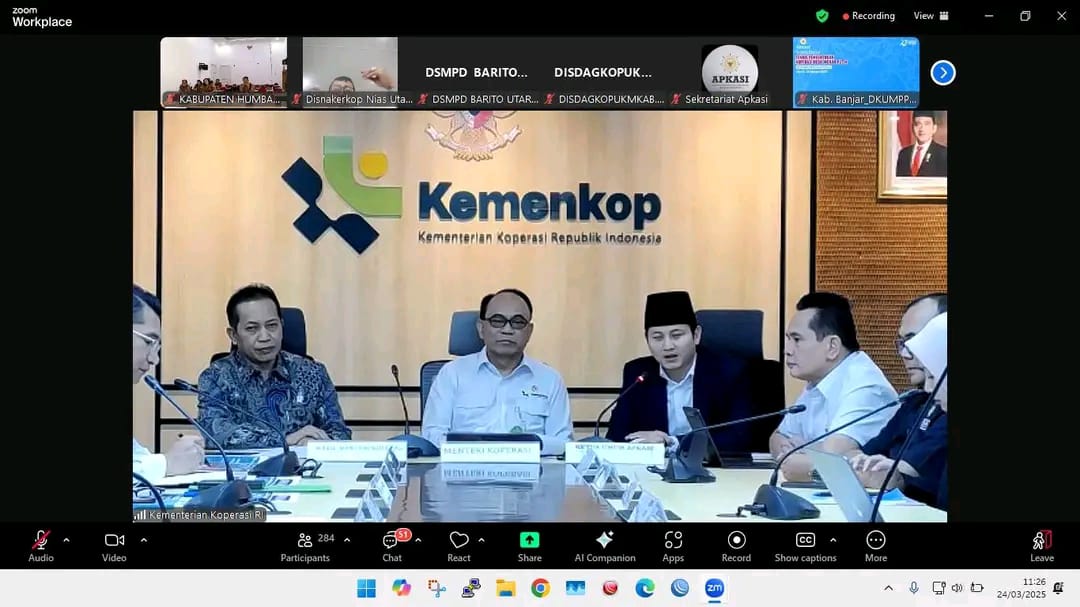 Humbahas || Jurnal Polisi Pos – Bupati Humbang Hasundutan (Humbahas), Dr. Oloan P. Nababan, S.H., M.H., didampingi Kepala Dinas Koperasi, Tenaga Kerja, dan Transmigrasi (Kopenaker) Nurlija Pasaribu serta Kepala Dinas Pemberdayaan Masyarakat Desa, Perlindungan Perempuan dan Anak (DPMDP2A) Maradu Napitupulu, mengikuti Sosialisasi Teknis Pembentukan Koperasi Desa Merah Putih secara virtual di ruang rapat Sekretariat Daerah Kabupaten Humbahas, Senin (24/3/2025).
