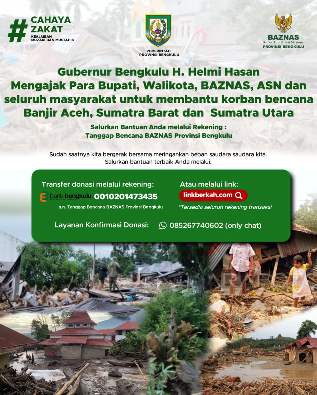 Sementara itu, masyarakat Bengkulu dapat menyalurkan bantuan bagi korban bencana di Aceh, Sumatera Barat, dan Sumatera Utara melalui Rekening Tanggap Bencana BAZNAS Bengkulu di Bank Bengkulu dengan nomor 0010201473435, atau melalui aplikasi Linkberkah.com. Layanan BAZNAS juga dapat diakses melalui WhatsApp 0851 4234 3932 maupun situs resmi www.bengkulu.baznas.go.id.