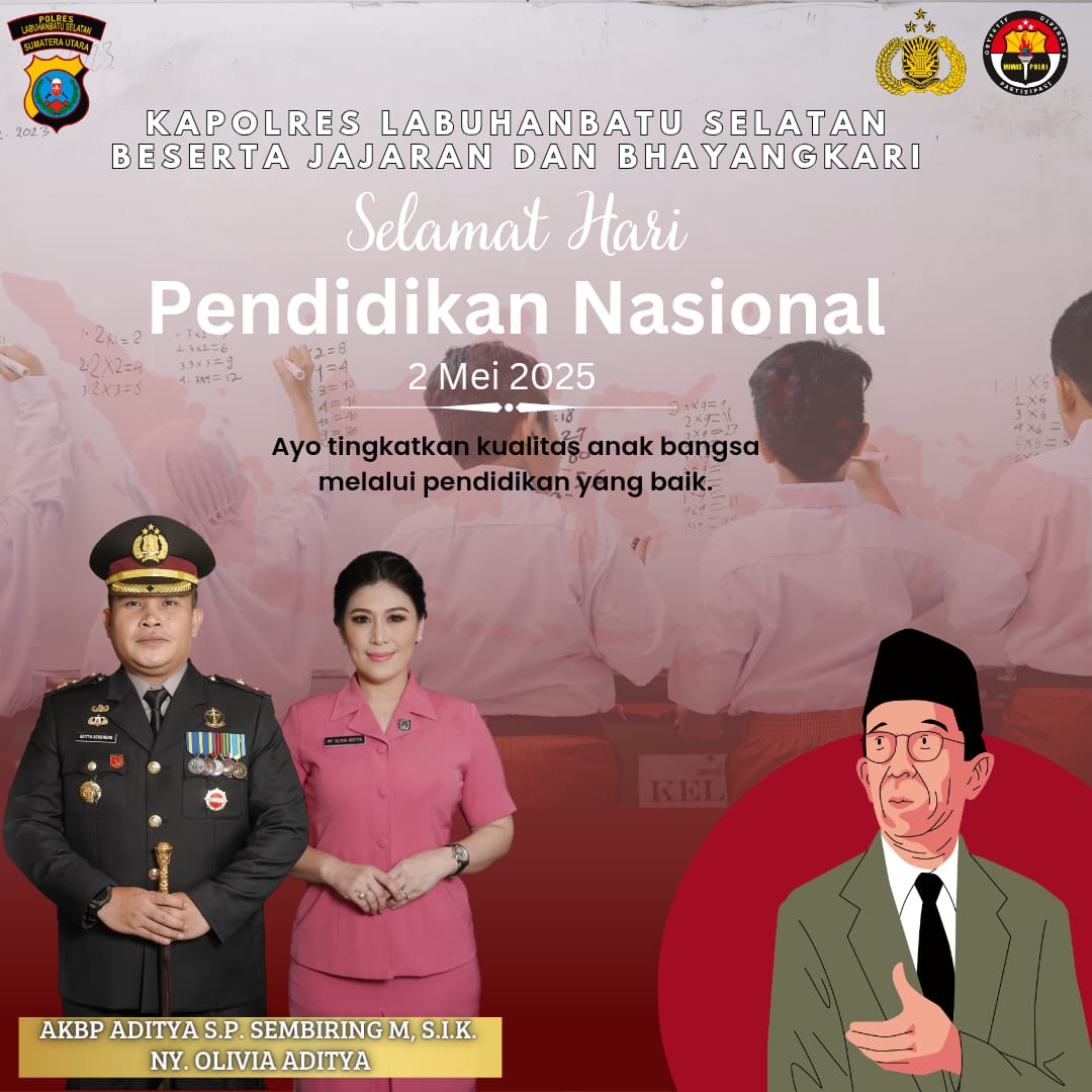 JPPOS.ID|| Labuhanbatu Selatan – Dalam rangka memperingati Hari Pendidikan Nasional yang jatuh pada 2 Mei 2025, Kapolres Labuhanbatu Selatan, AKBP Aditya S.P. Sembiring Muham, S.I.K., bersama jajaran dan Bhayangkari, menyampaikan ucapan selamat Hari Pendidikan Nasional kepada seluruh insan pendidikan di Indonesia, khususnya di Kabupaten Labuhanbatu Selatan.