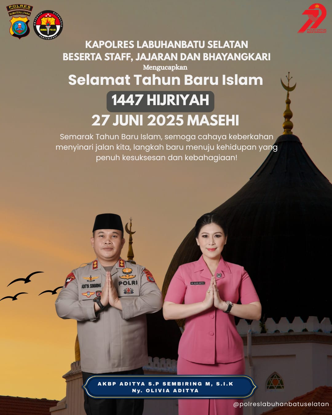 JPPOS.ID | Labuhanbatu Selatan —Dalam rangka menyambut Tahun Baru Islam 1 Muharram 1447 Hijriah yang jatuh pada tahun 2025 Masehi, Kapolres Labuhanbatu Selatan, AKBP Aditya S.P. Sembiring Muham, S.I.K., bersama jajaran staf dan Bhayangkari Cabang Labuhanbatu Selatan menyampaikan ucapan selamat kepada seluruh masyarakat yang merayakan momen sakral tersebut.