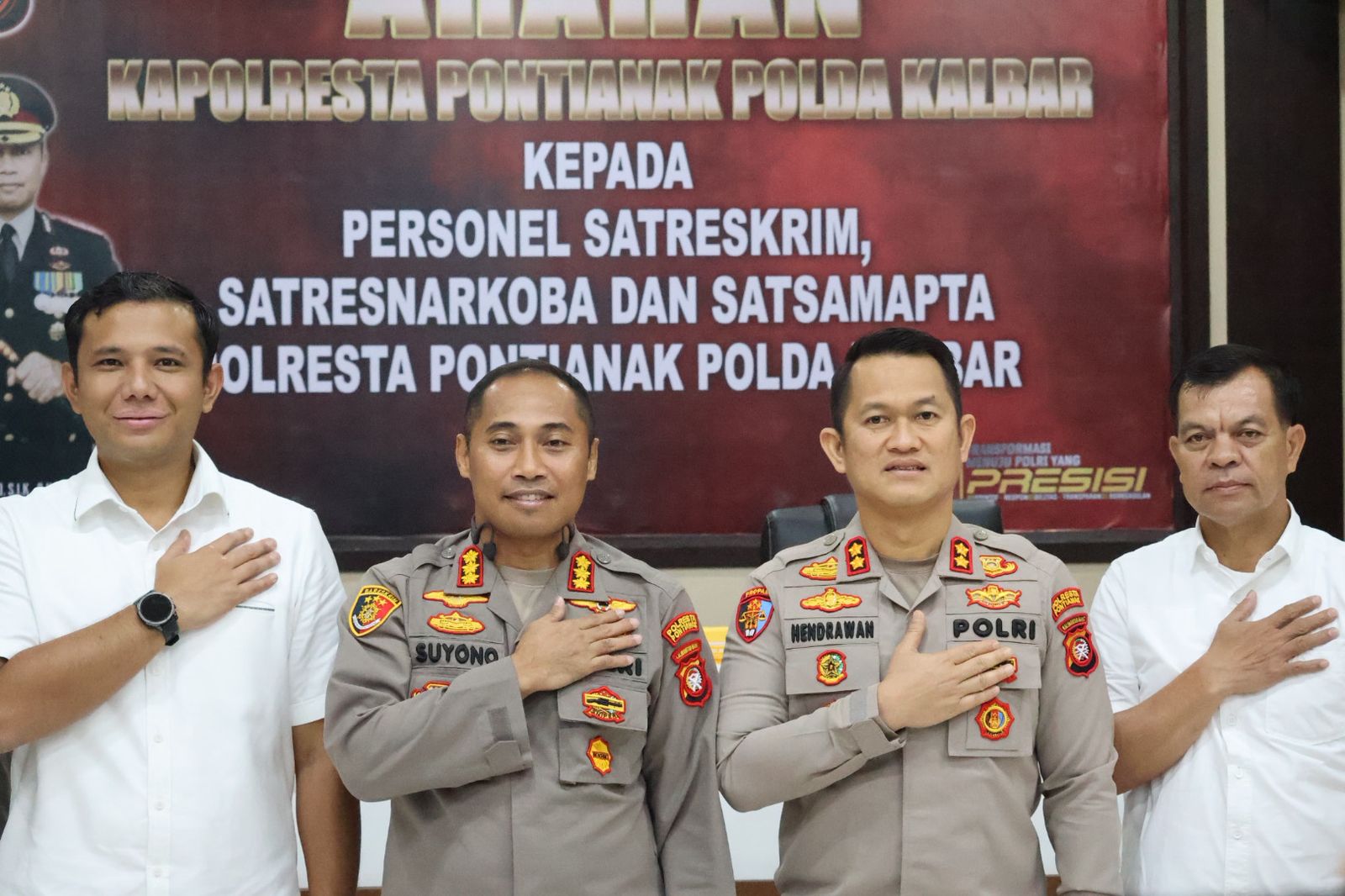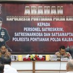JPPOS.ID | Pontianak, Kalbar – Kapolresta Pontianak Kombes Pol Suyono, S.I.K., S.H., M.H., memberikan arahan langsung kepada personel Satuan Reserse Kriminal (Sat Reskrim), Satuan Reserse Narkoba (Sat Resnarkoba), dan Satuan Samapta di Aula Polresta Pontianak, Sabtu pagi (9/8/2025).