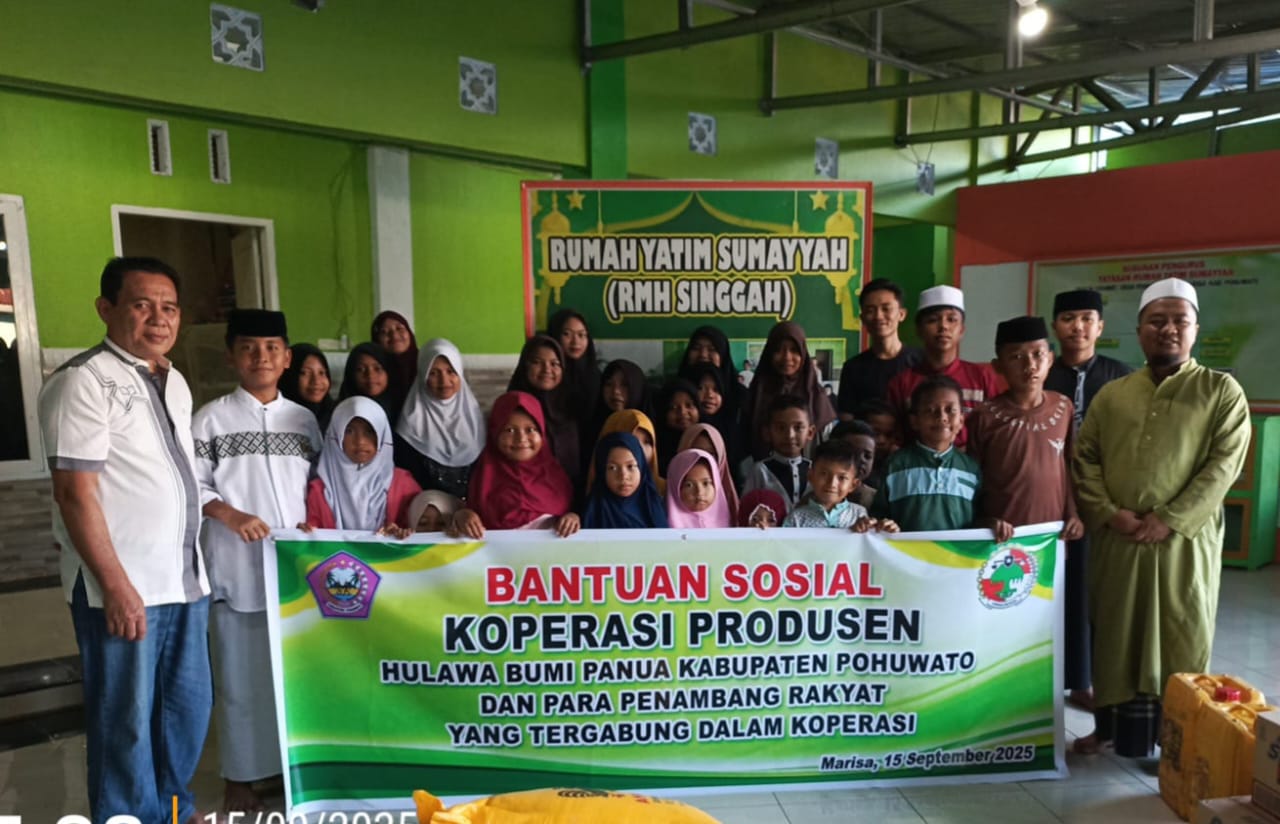 Koperasi Hulawa Bumi Panua Kabupaten Pohuwato menggelar aksi bakti sosial dengan menyantuni anak-anak yatim pada Senin (15/9). Kegiatan yang berlangsung penuh kehangatan ini dipimpin langsung oleh Ketua Koperasi, Budiyanto Saleh, putra daerah sekaligus tokoh masyarakat Pohuwato.