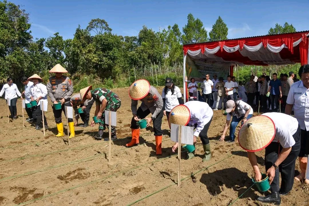 Bupati Humbang Hasundutan Dr. Oloan P. Nababan, S.H., M.H. bersama Kapolres Humbang Hasundutan AKBP Arthur Sameaputty, jajaran TNI, serta masyarakat melakukan penanaman benih jagung di Desa Pasaribu, Kecamatan Doloksanggul, Rabu (8/10/2025).