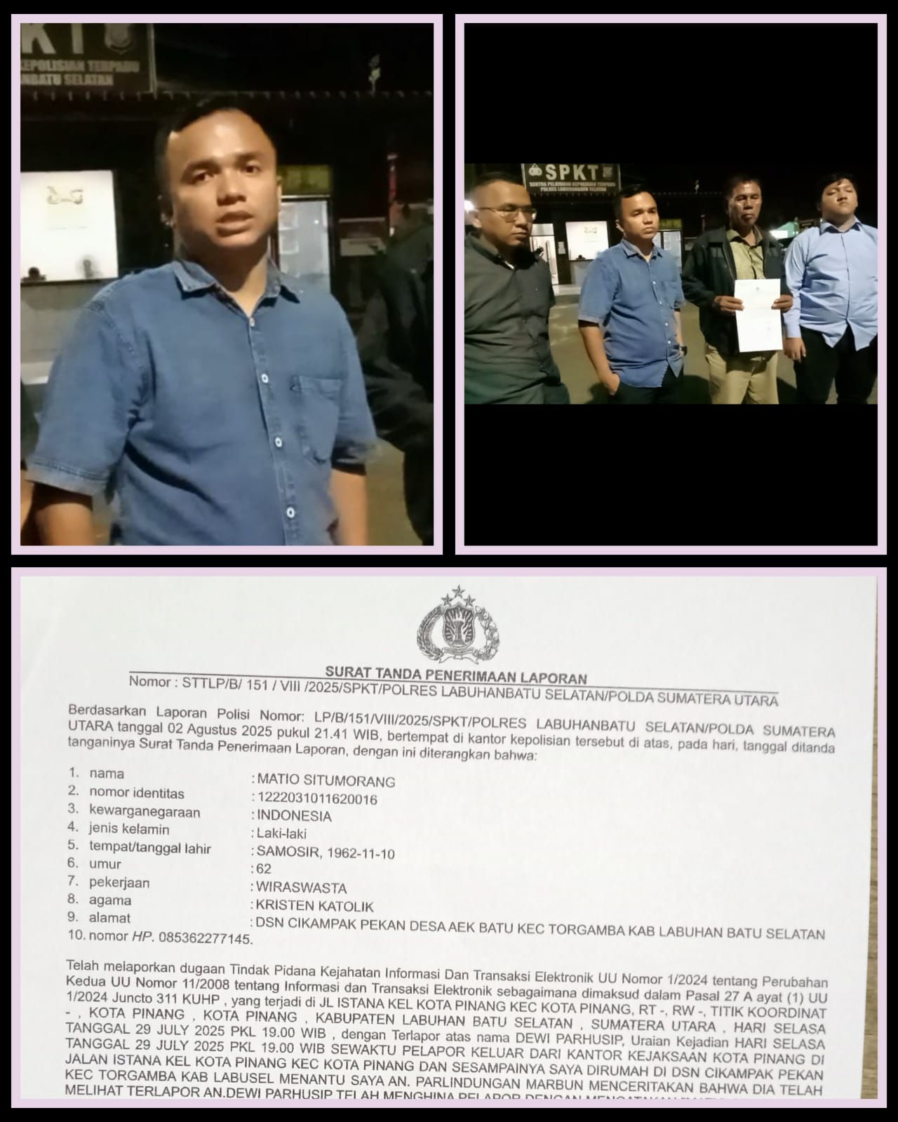 Matio Situmorang resmi melaporkan pemilik akun Facebook berinisial DP ke Polres Labuhanbatu Selatan atas dugaan penghinaan dan pencemaran nama baik. Laporan tersebut disampaikan pada Sabtu, 2 Agustus 2025, didampingi oleh kuasa hukumnya, Maja Simarmata, SH, MH.