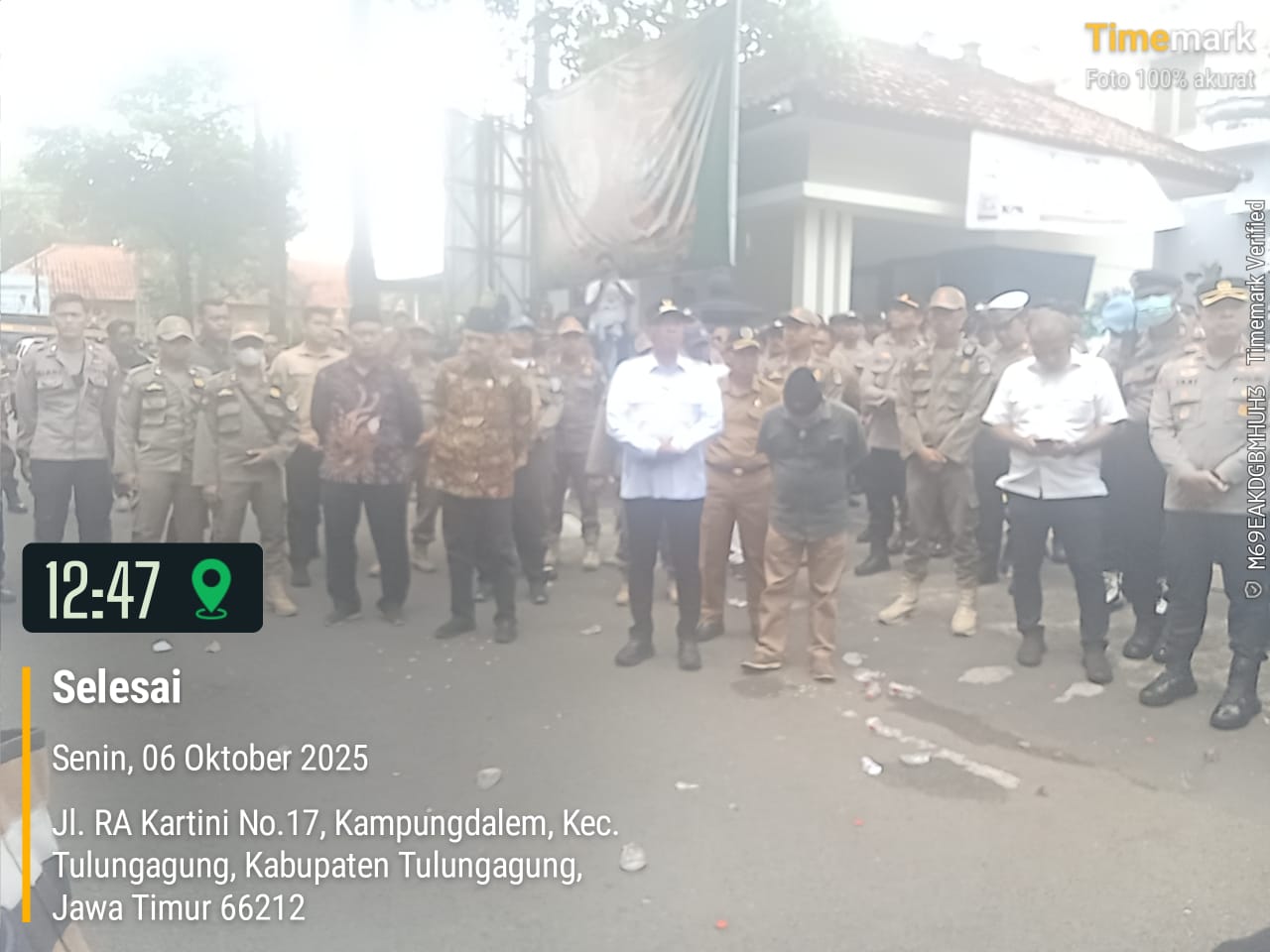 Tak lama kemudian, massa mendapat sambutan langsung dari jajaran pejabat daerah. Tampak hadir Bupati Tulungagung, H. Gatut Sunu Wibowo, S.E., M.E., Ketua DPRD Tulungagung, Marsono, S.Sos., serta Drs. Tri Hariadi, M.Si., bersama sejumlah anggota dewan lainnya.