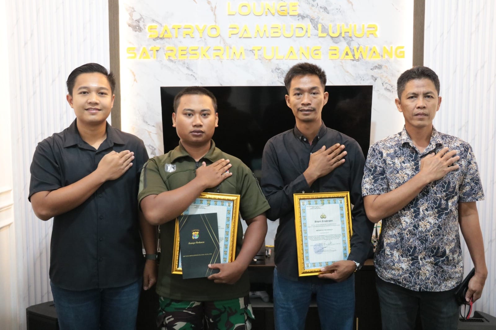 Ada dua orang masyarakat yang menerima piagam penghargaan dari Polres Tulang Bawang yakni Antoniyos Feri Renaldi (30), berprofesi buruh, warga Desa Bumi Baru, Kecamatan Blambangan Umpu, Kabupaten Way Kanan, Provinsi Lampung, dan Rizqi Ramadhani (22), berprofesi anggota Komcad, warga Desa Karang Anyar, Kecamatan Tegalampel, Kabupaten Bondowoso, Provinsi Jawa Timur.