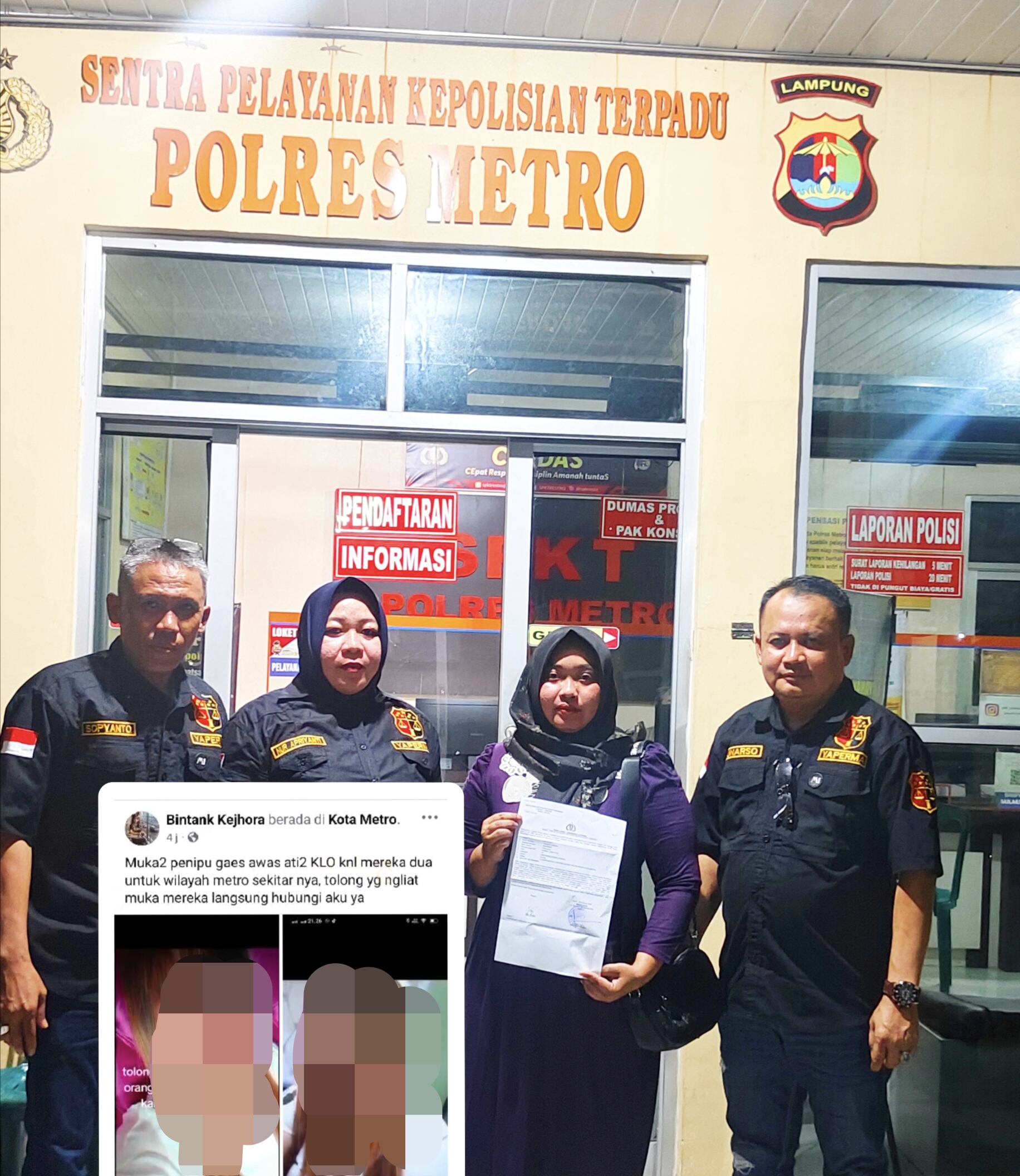 Jppos.id, Metro, Lampung – Sri Utami, dengan didampingi tim dari DPW LPK YAPERMA Sumbagsel, resmi melaporkan pemilik akun Facebook Bintank Kejhora ke SPKT Polres Metro, Polda Lampung atas dugaan pencemaran nama baik melalui media sosial. Laporan ini teregistrasi dengan Nomor: LP/B/85/II/2025/SPKT/POLRES METRO/POLDALAMPUNG, yang dibuat pada 25 Februari 2025, sekitar pukul 22.00 WIB.