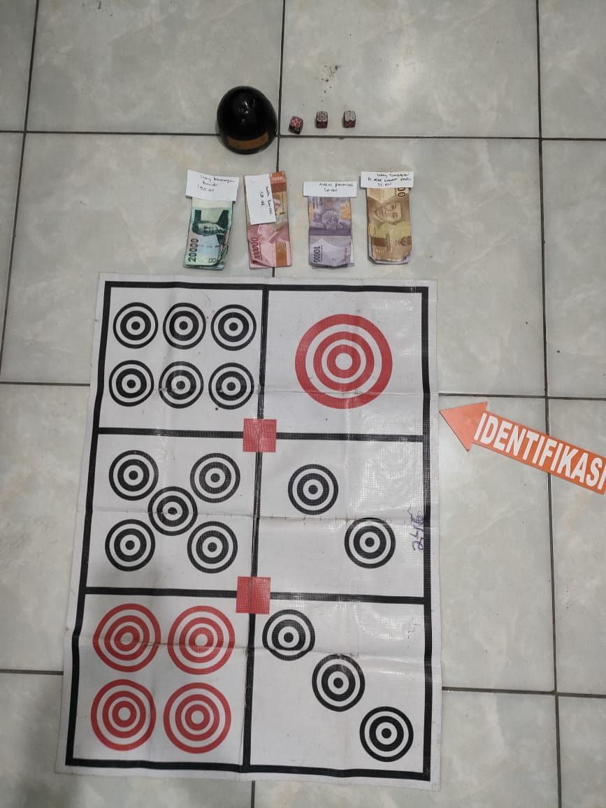 Kapolsek menuturkan barang bukti yang diamankan berupa tempurung/batok kelapa yang telah dicat warna hitam, perlak dengan gambar mata dadu yang digunakan sebagai tempat pasang taruhan, mata dadu dan Uang tunai sejumlah Rp. 735 Ribu.