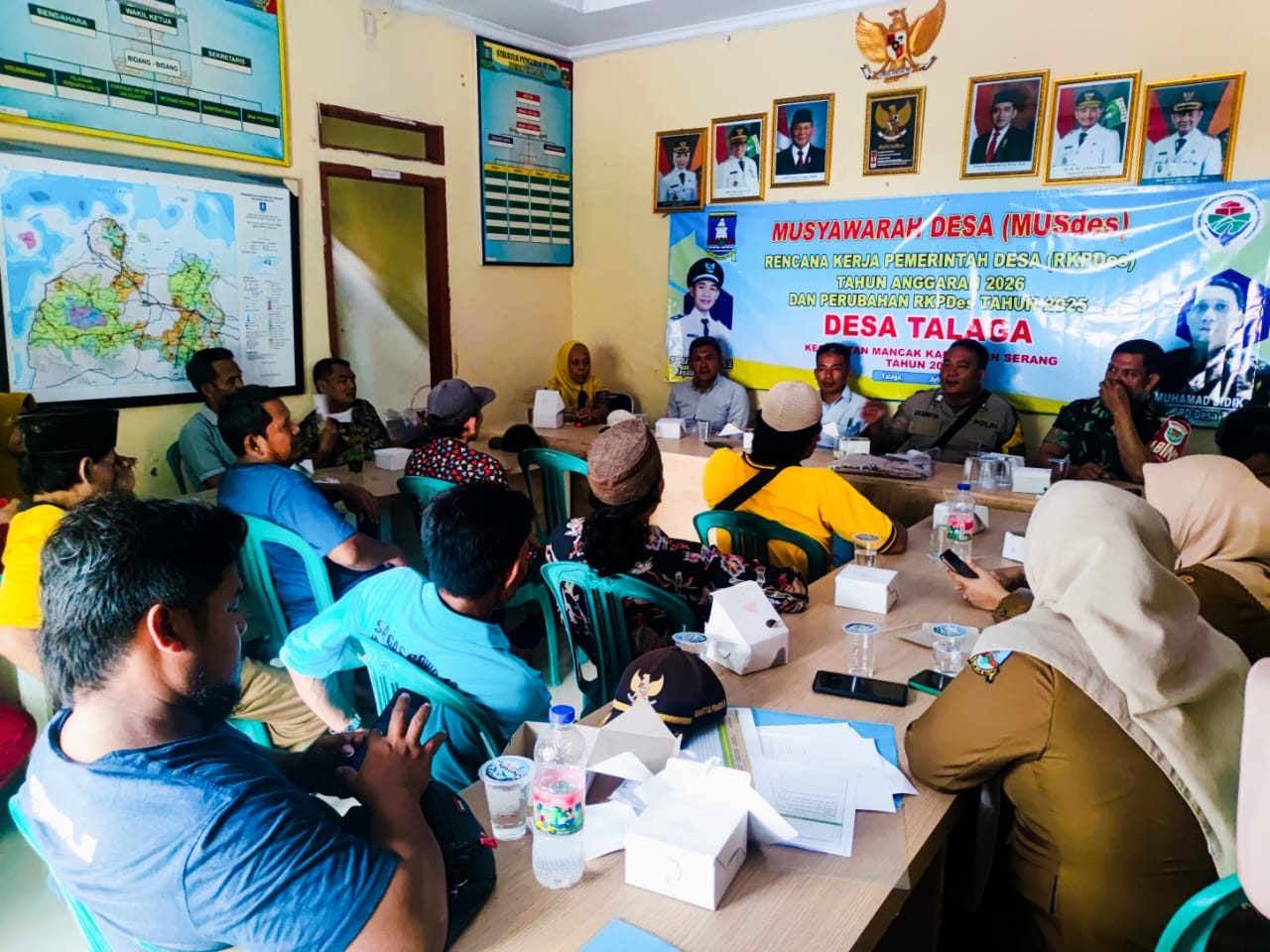 Kapolres Cilegon Polda Banten AKBP Dr. Martua Raja Taripar Lut Silitonga melalui Kapolsek Mancak IPTU Khaerul beserta jajaran Personel piket Bhabinkamtibmas melaksanakan kegiatan MUSYAWARAH DESA ( MUSDES) dalam rangka Rencana Kerja pemerintahan Desa tahun anggaran 2026 dan perubahan RKPDes tahun 2025 dimana dalam acara tersebut merupakan pembahasan tentang rencana pembangunan Desa pada tahun 2026 guna meningkatkan fasilitas maupun kwsejahteraan masyarakat di Desa Talaga Kec. Mancak Kab. Serang.