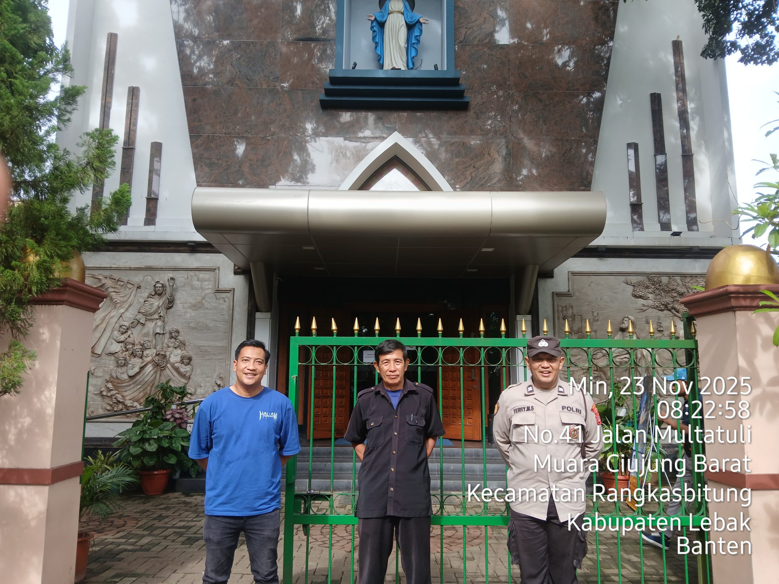 Melaksanakan giat patroli dan monitoring ke tempat ibadah gereja, sekaligus sampaikan pesan Kamtibmas kepada Jemaat Gereja Santa Maria Tak Bernoda.Minggu (23/11/2025)