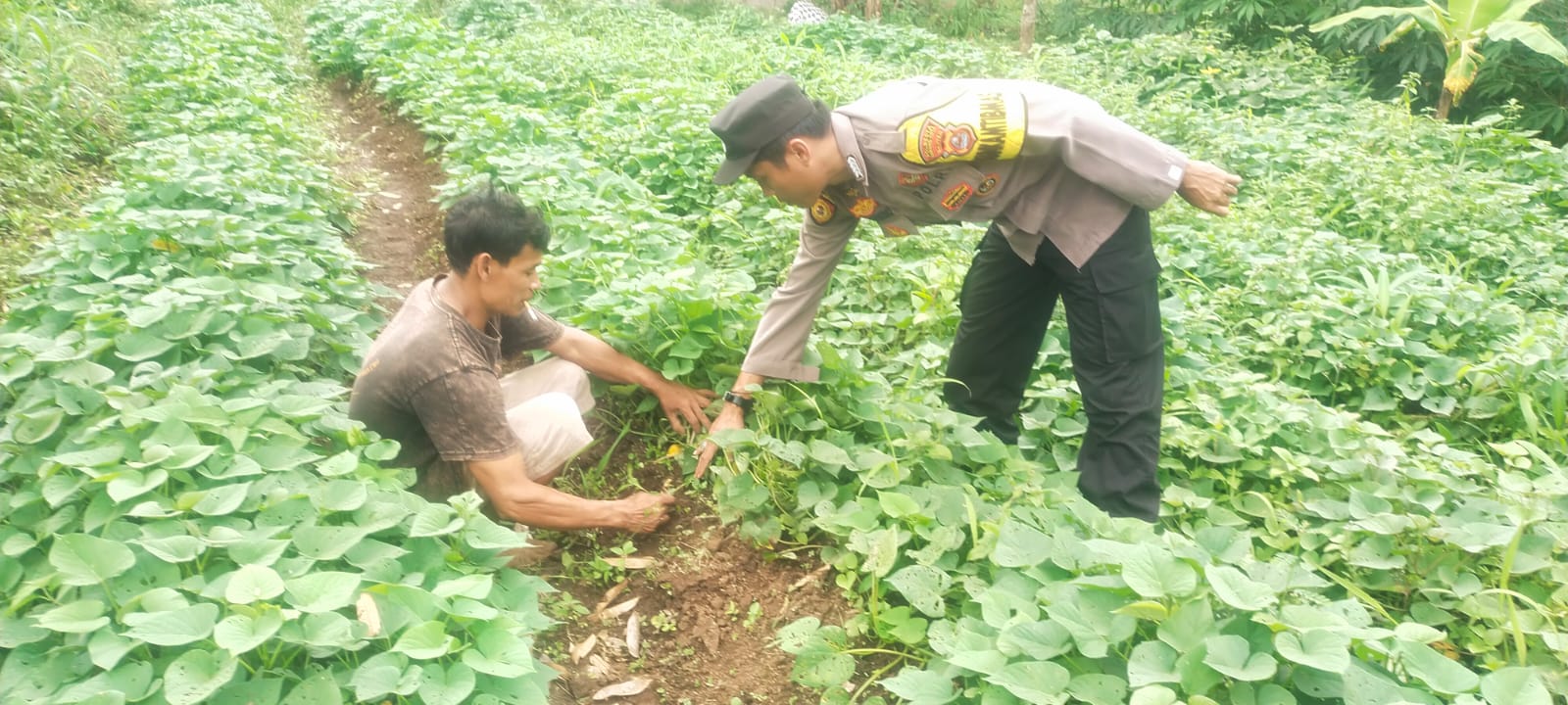 Bripka Edi sebagai Bhabinkamtibmas mengajak berkomunikasi petani yang sedang memanen Ubi dan menanyakan apabila ada kendala-kendala saat bercocok tanam serta melihat sejauh mana ketahanan pangan di Desa binaannya.