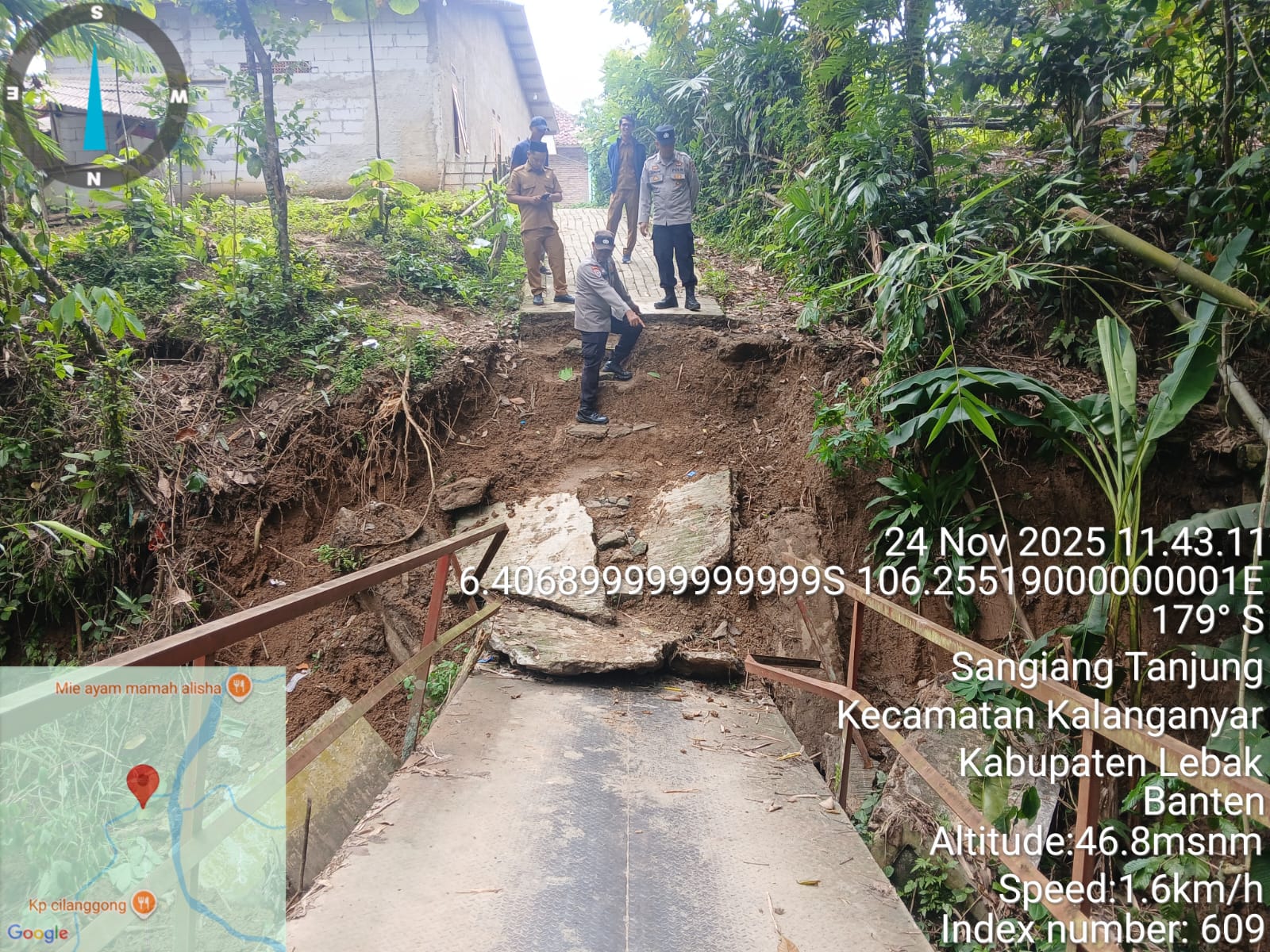 JPPOS.ID || LEBAK-Kapolsek Rangkasbitung Polres Lebak AKP Adi Irawan,.SH,perintahkan Kanit Binmas Polsek Rangkasbitung untuk mengroscek jembatan yang amblas, akibat Curah hujan tinggi di Jalan Ariskan Kampung Cikadueun menuju Jalan Makmun Kampung Jasinga,Desa Sangiang Tanjung,Kecamatan Kalanganyar,Kabupaten Lebak.