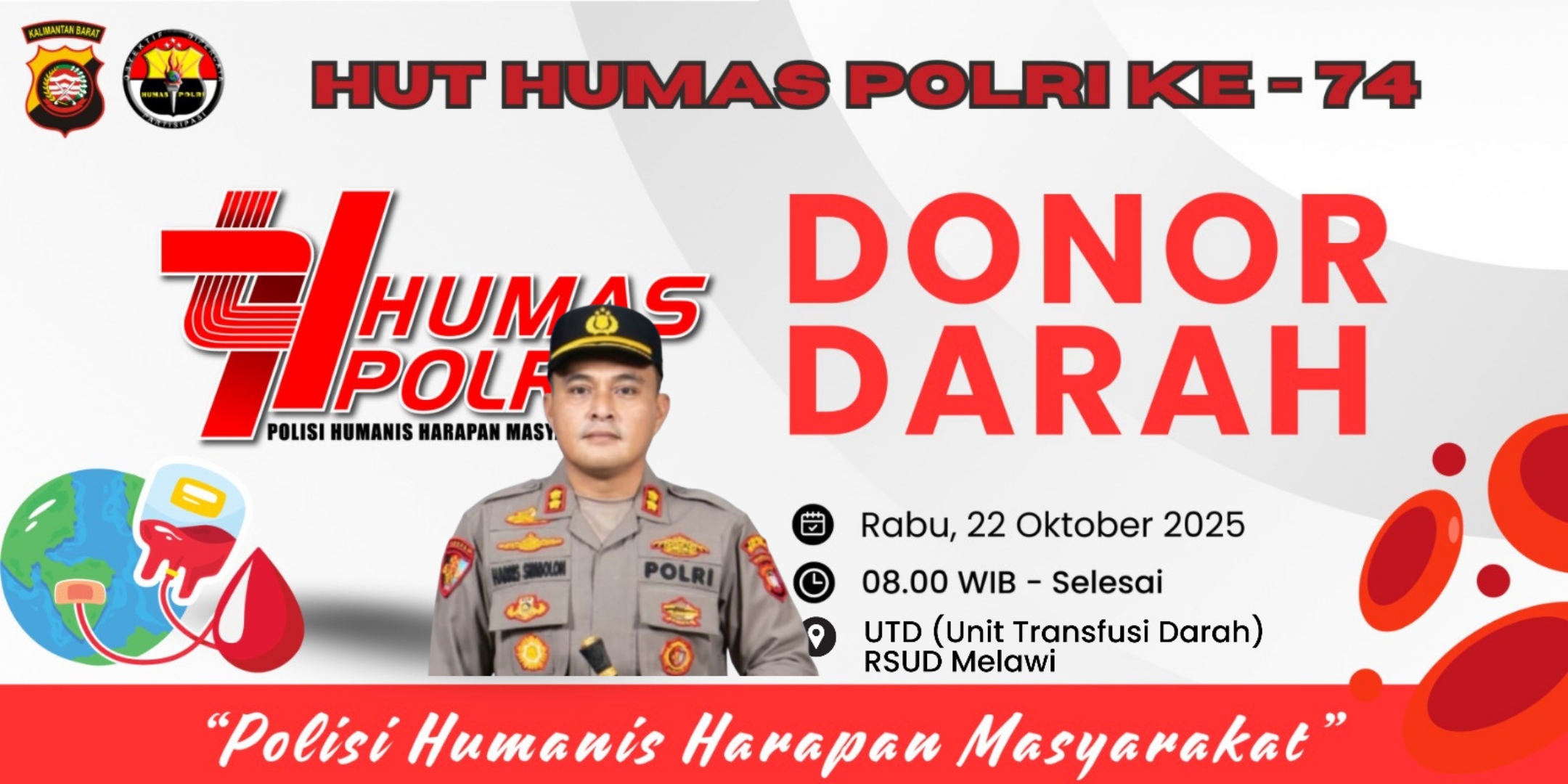 JPPOS.ID | Melawi, Kalbar – Dalam rangka memperingati Hari Jadi Humas ke-74, Humas Polres Melawi bekerja sama dengan Palang Merah Indonesia (PMI) dan Rumah Sakit Umum Daerah (RSUD) Melawi menggelar kegiatan donor darah. Kegiatan ini akan berlangsung pada hari Rabu, 22 Oktober 2025, pukul 08.00 WIB di RSUD Melawi.