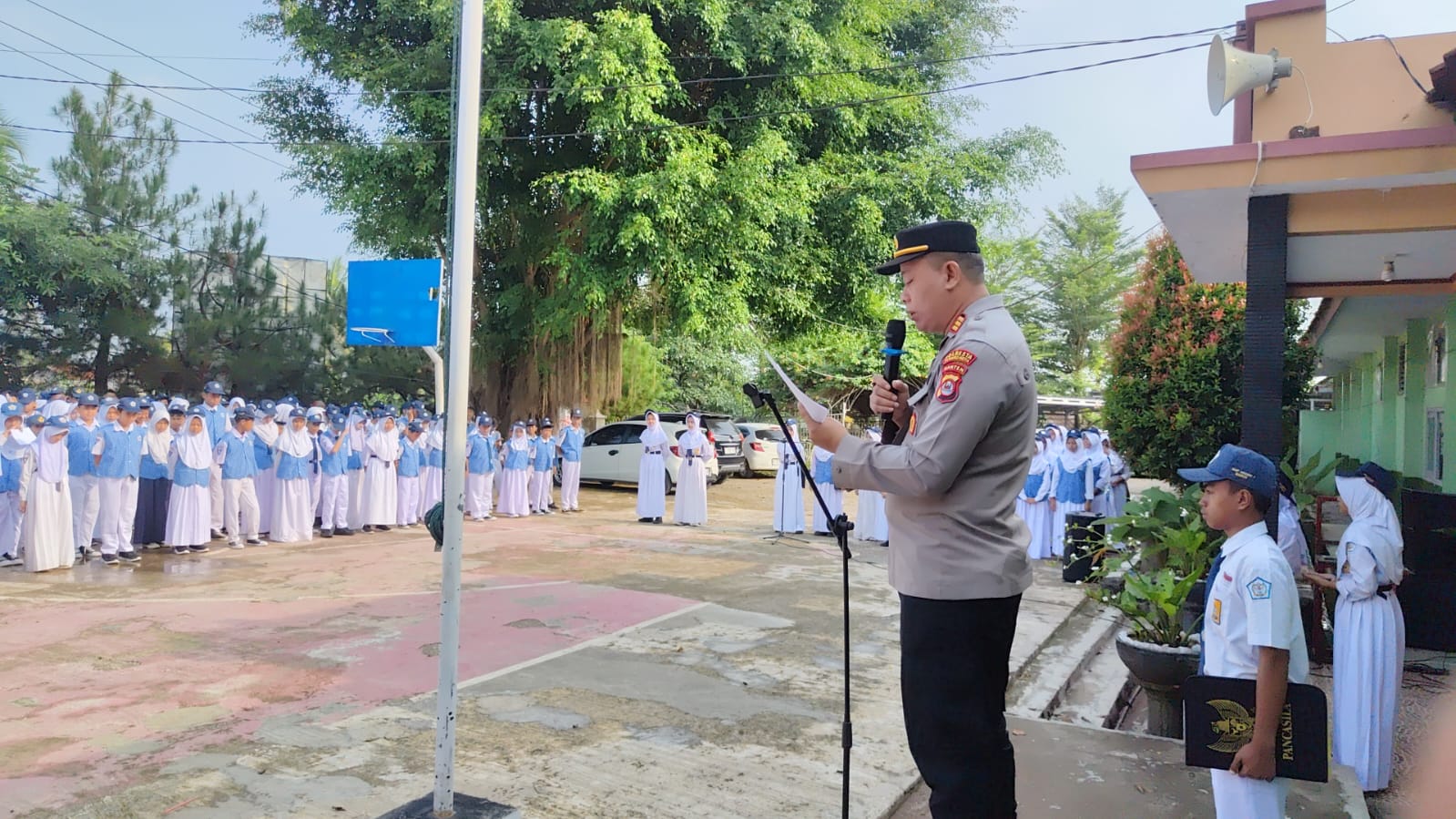 JPPOS.ID || POLRESTA SERKOT _ Kapolsek Baros Polresta Serkot AKP Dede Supratman, SH menjadi irup dalam Upacara rutin hari Senin di SMPN 01 Baros, Senin (29/09/2025)