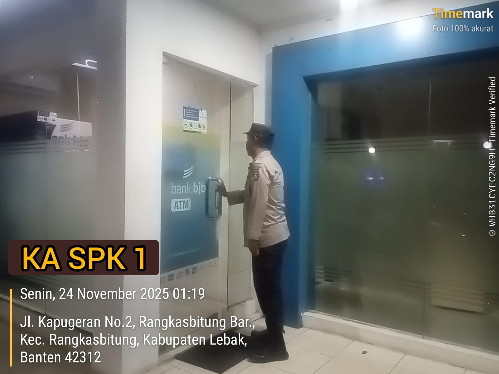 Melaksanakan giat patroli ke Obyek Vital seperti Perbankan, Perkantoran Pemda dan Toko Waralaba sekaligus cek ATM Bank BJB Rangkasbitung.Minggu pagi 24 November 2025,pukul.01.21 Wib.