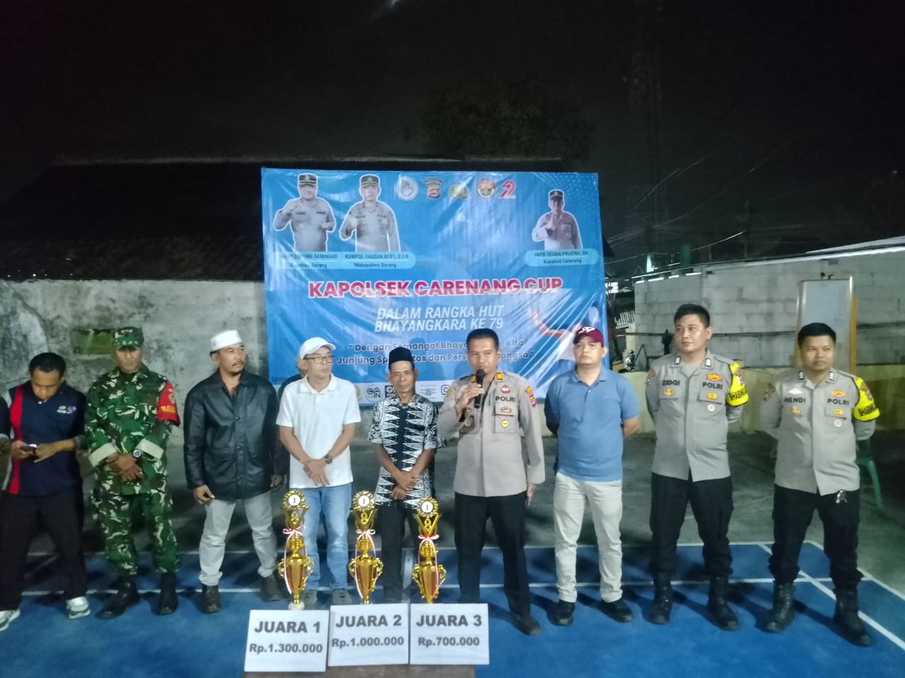 Senada dengan itu, Camat Carenang dalam sambutannya menyampaikan apresiasi dan dukungan terhadap kegiatan tersebut, serta mengucapkan selamat HUT Bhayangkara ke-79 kepada seluruh anggota Polri. Ia menekankan pentingnya menjunjung tinggi sportivitas dalam setiap pertandingan.