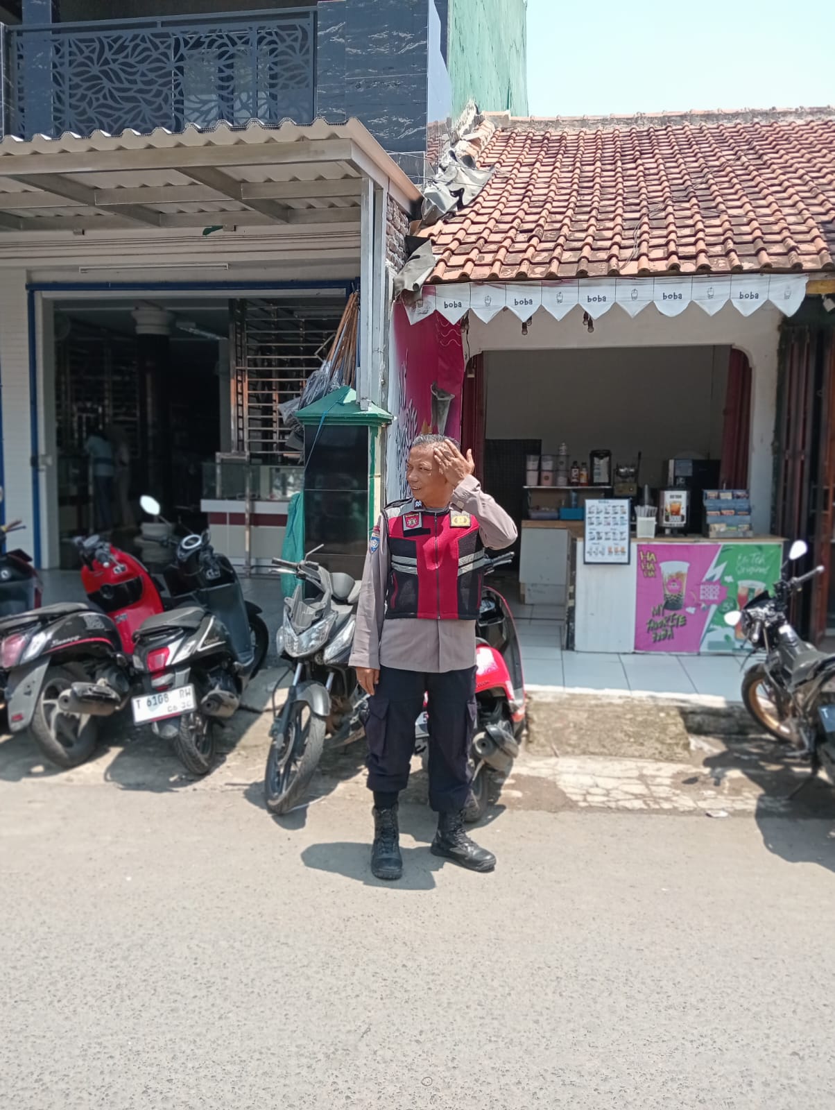 Intensif, jajaran personil Polsek Tegalwaru giat patroli siang dan monitoring areal parkir kendaraan roda dua yang ada di wilayah pasar tradisional Loji.