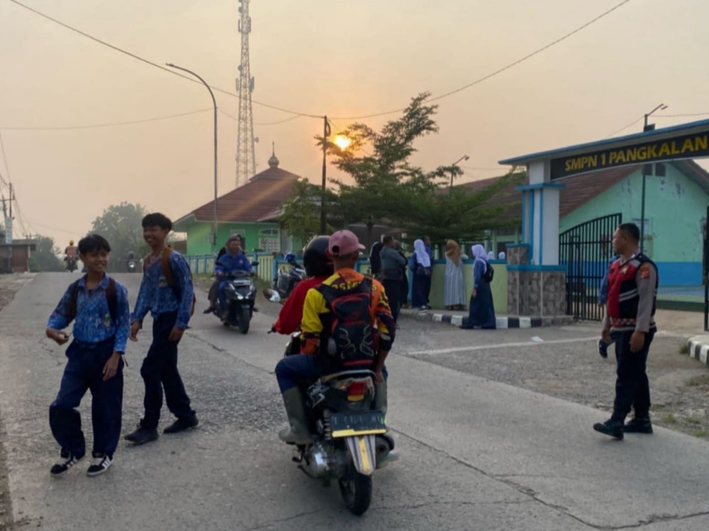 JPPOS.ID || Polres Karawang – Anggota Polsek Pangkalan, Aipda Encuy Sukarya dan Bripka Ahmad Supriatna melaksanakan pengaturan lalu lintas sekaligus bantu pelajar menyeberang jalan di depan SMPN 1 Pangkalan, Kabupaten Karawang, Kamis (6/11/2025).
