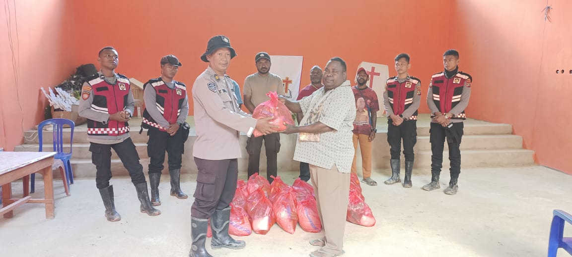 JPPOS.ID || Manokwari, Papua Barat – Polres Pegunungan Arfak menyalurkan bantuan sosial berupa sembako kepada warga terdampak bencana tanah longsor di Kampung Jim, Distrik Catubouw, Kabupaten Pegunungan Arfak. Kegiatan penyaluran bantuan berlangsung pada Sabtu (24/5) pukul 10.00 WIT, bertempat di Gereja Jemaat Petrus Kampung Jim.