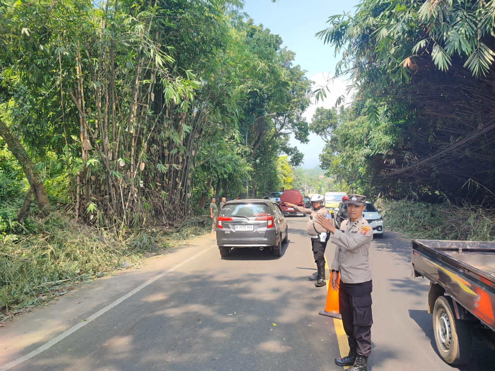 JPPOS.ID || POLRESTA SERKOT_Personil Patroli Polsek Curug Polresta Serkot Polda Banten Aipda Irwan dan Bripka Tri W Laksankan kegiatan pengaturan lalu lintas (gatur) pada saat penebangan pohon yang menghalangi jalan diJln Raya Serang-Pandeglang Lingk Sarongge Kel Kamanisan Kec Curug Kota Serang.