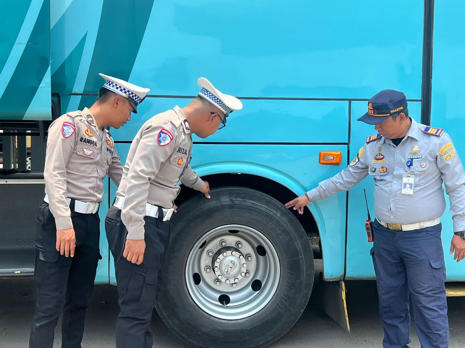 Satlantas Polres Karawang Lakukan Pengecekan Kondisi Kendaraan Bus Antar Kota di Terminal Klari
