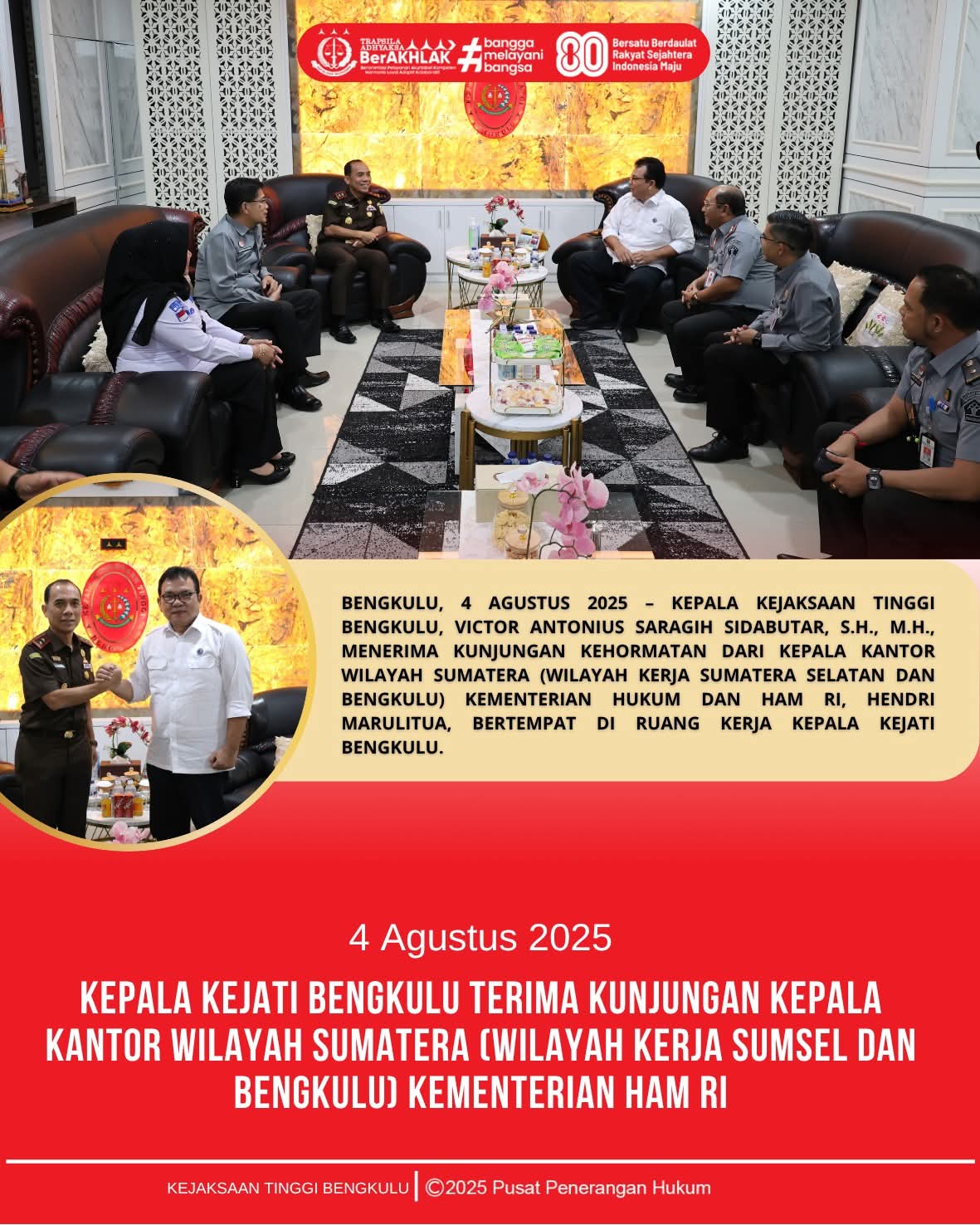 JPPOS .ID || BENGKULU – Bengkulu 4 Agustus 2025 Kepala Kejaksaan Tinggi Bengkulu, Victor Antonius Saragih Sidabutar, S.H., M.H., menerima kunjungan kehormatan dari Kepala Kantor Wilayah Sumatera (Wilayah Kerja Sumatera Selatan dan Bengkulu) Kementerian Hukum dan HAM RI, Hendri Marulitua, bertempat di ruang kerja Kepala Kejati Bengkulu.